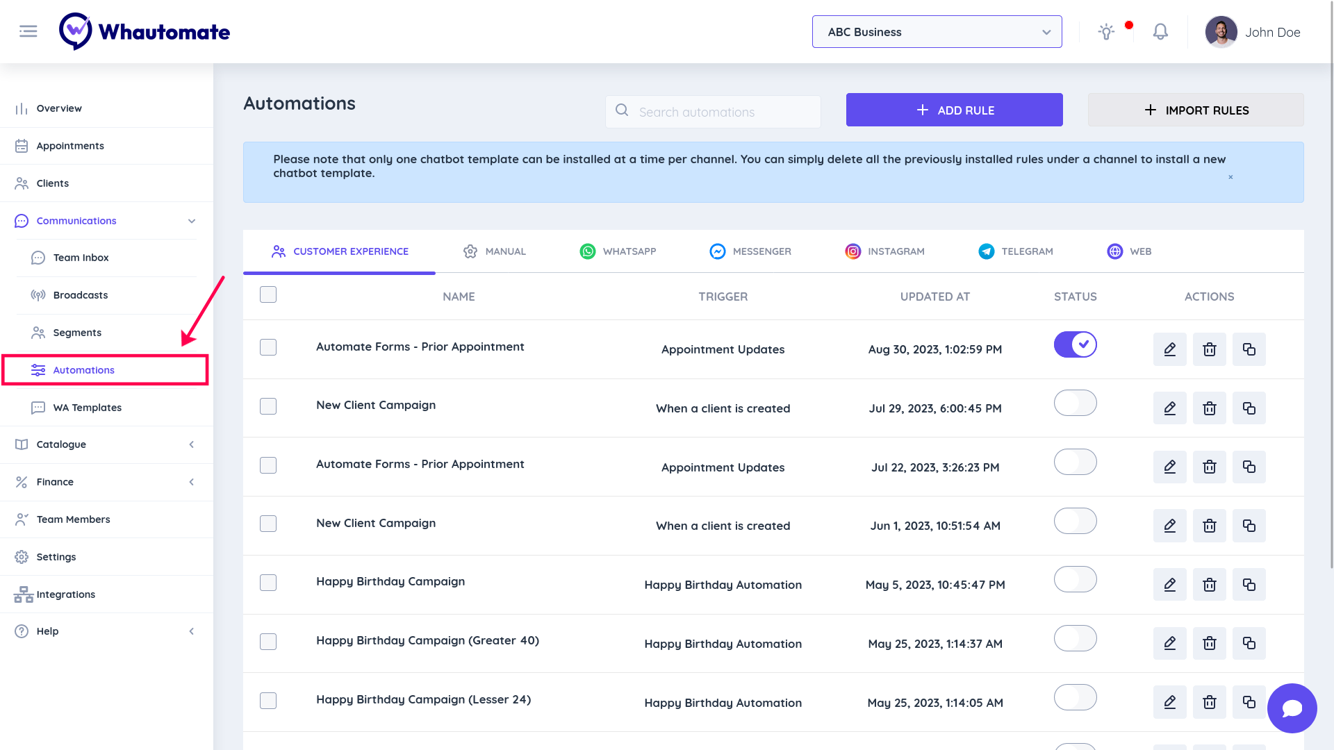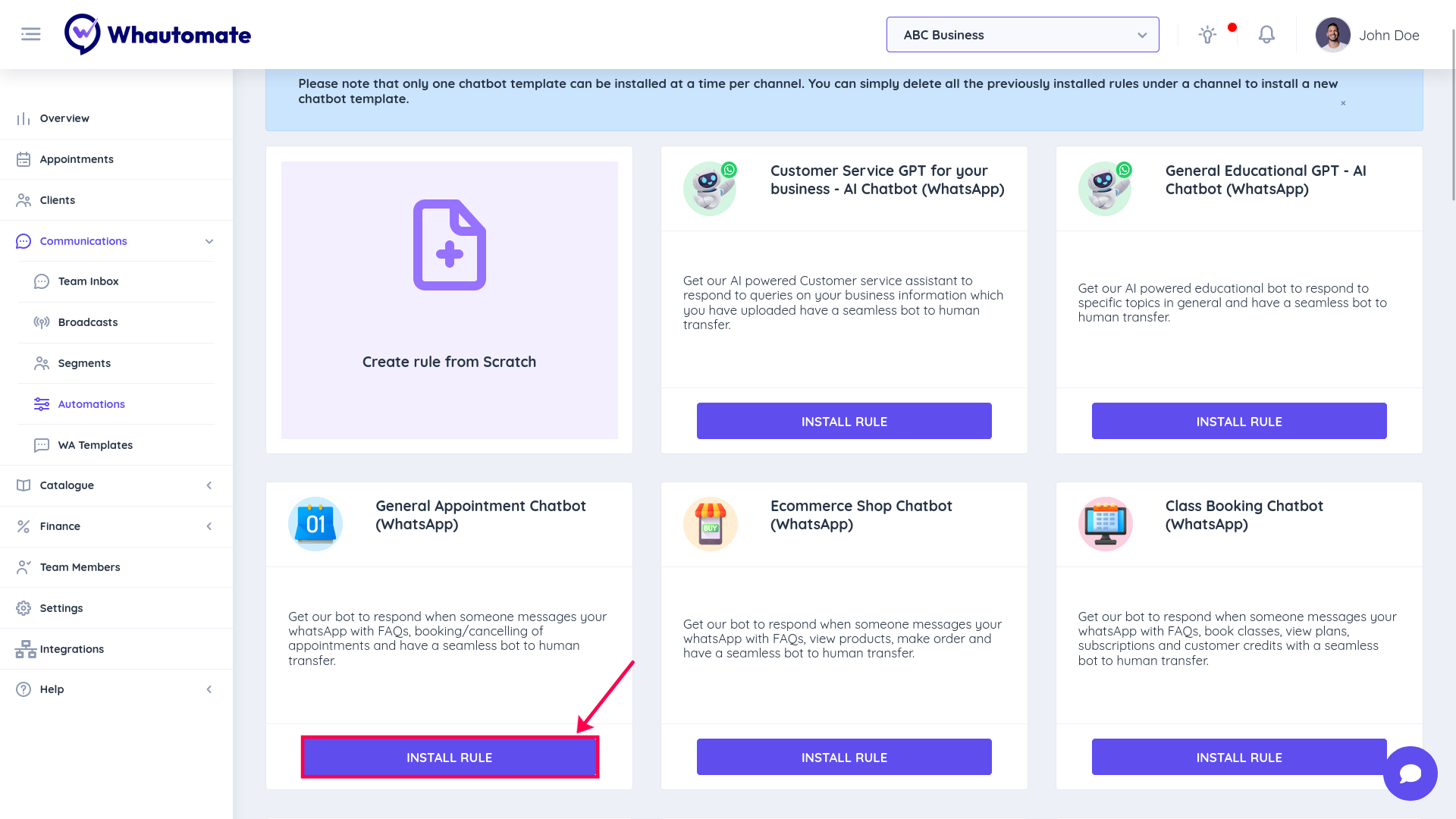 step 5: Please note that only one chatbot template can be installed at a time per channel. You can simply delete all the previously installed rules under a channel to install a new chatbot template.