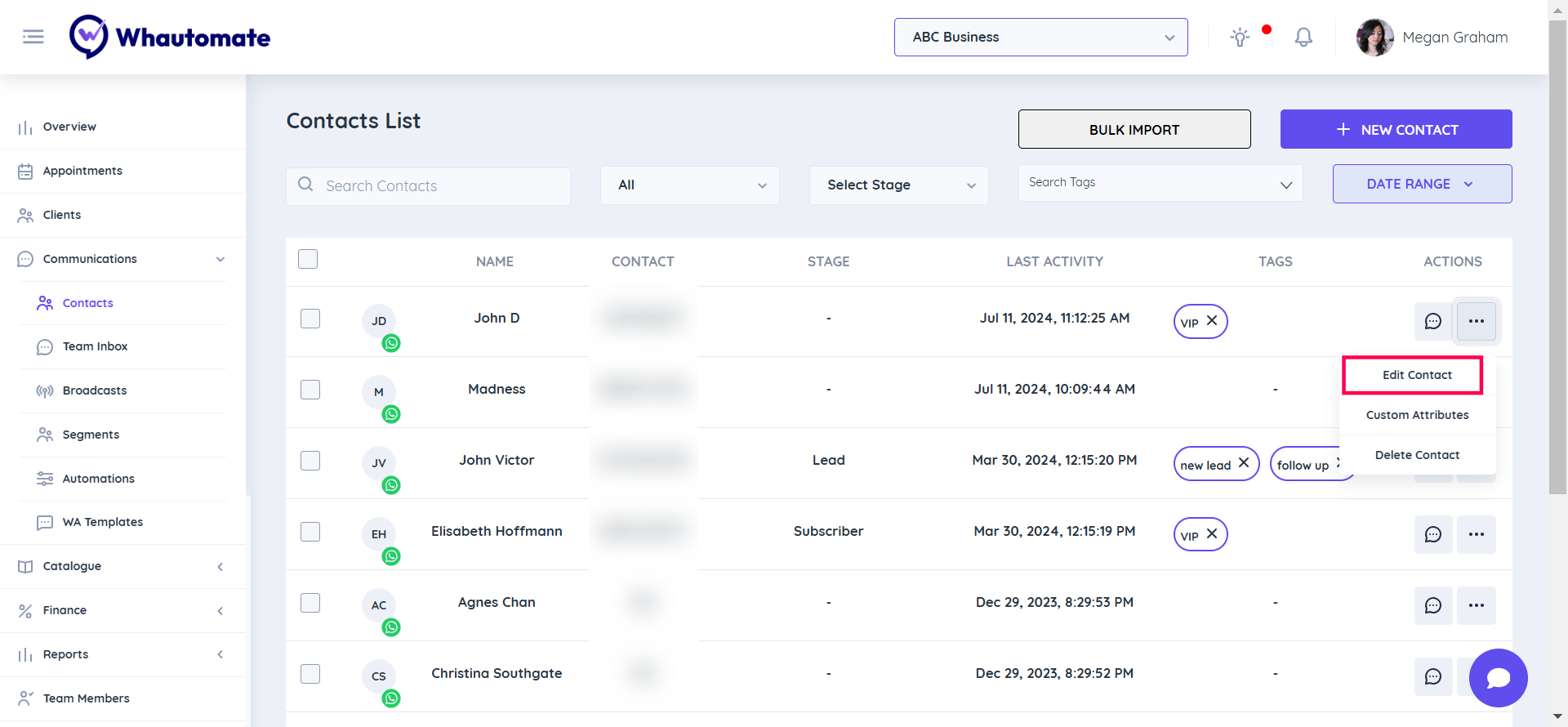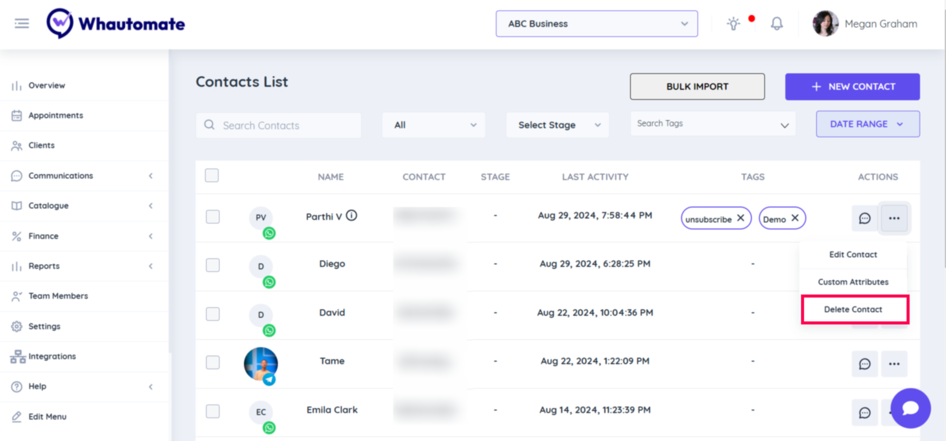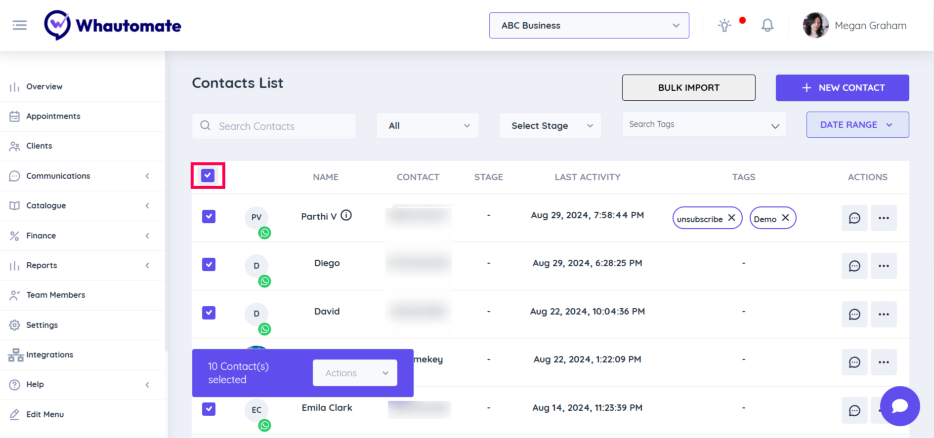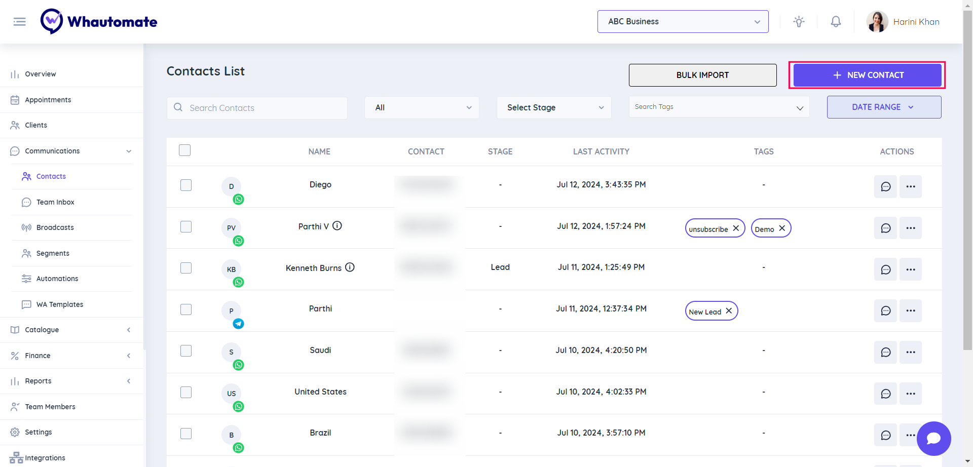 **Step 1:** Go to the **Whautomate app,** Select the **"Communications"** menu option, and Click the **"Contacts"** option to continue. 👇