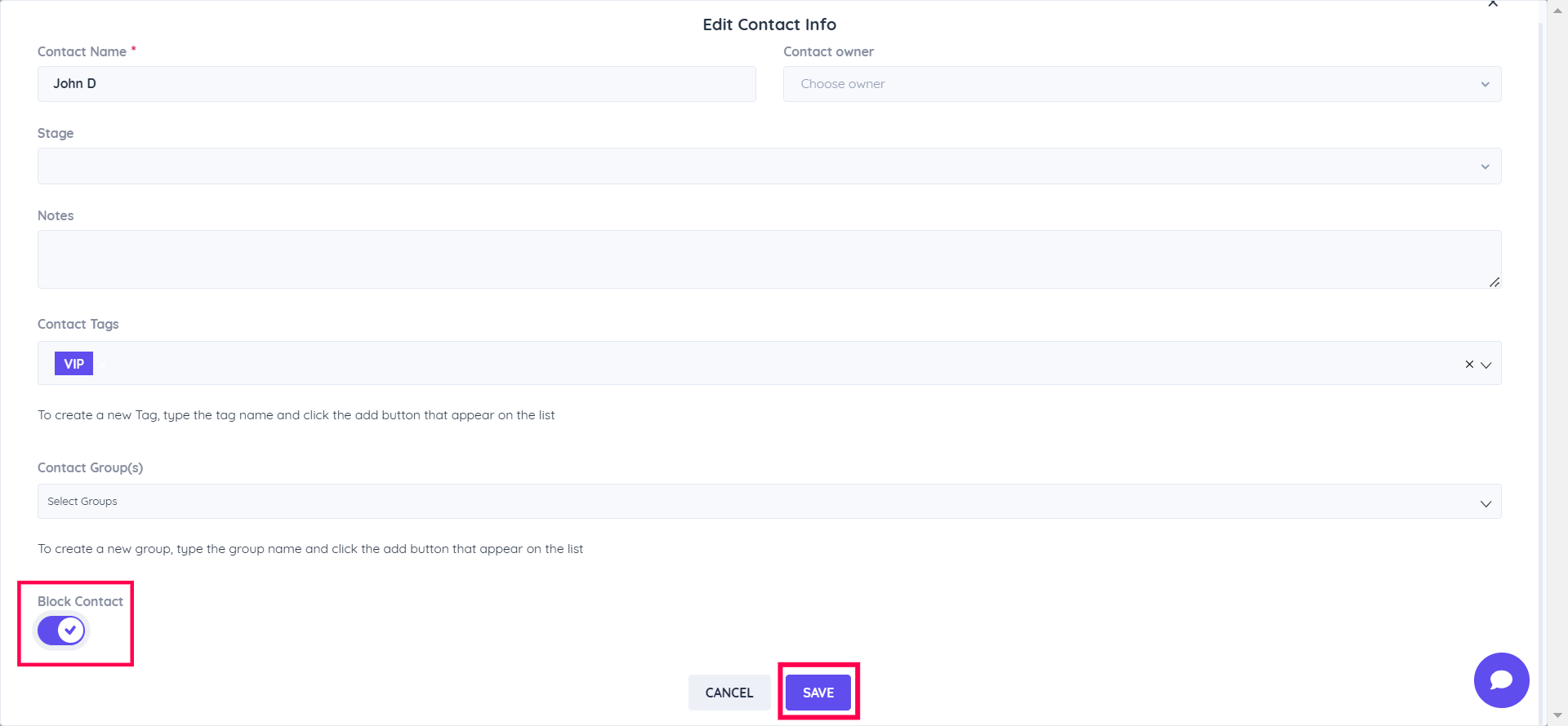 **Step 3:** Enable the **Block Contact** button and click the **Save** button to block the contact.