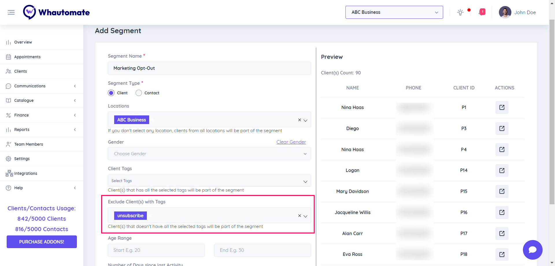 When clients send a Stop message to unsubscribe from marketing updates and notifications, they are tagged as **"Unsubscribe."** Once you save this segment, there's no need for constant editing. The segment automatically excludes clients with the **"Unsubscribe"** tag, ensuring that they are consistently removed from your marketing communications.