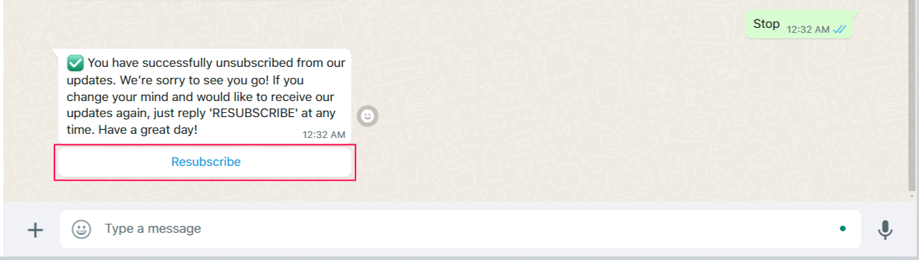 If clients or contacts wish to receive updates again, they can click the **"Resubscribe"** button or send a "RESUBSCRIBE" message. This will automatically remove the "Unsubscribe" tag and add the client back to the marketing segment list.