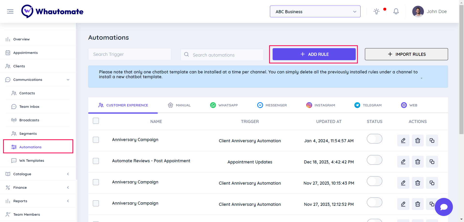 **Step 2:** Go to the **Whautomate app,** Select the **Automation** menu option, and Click the **Add Rule** button to continue.