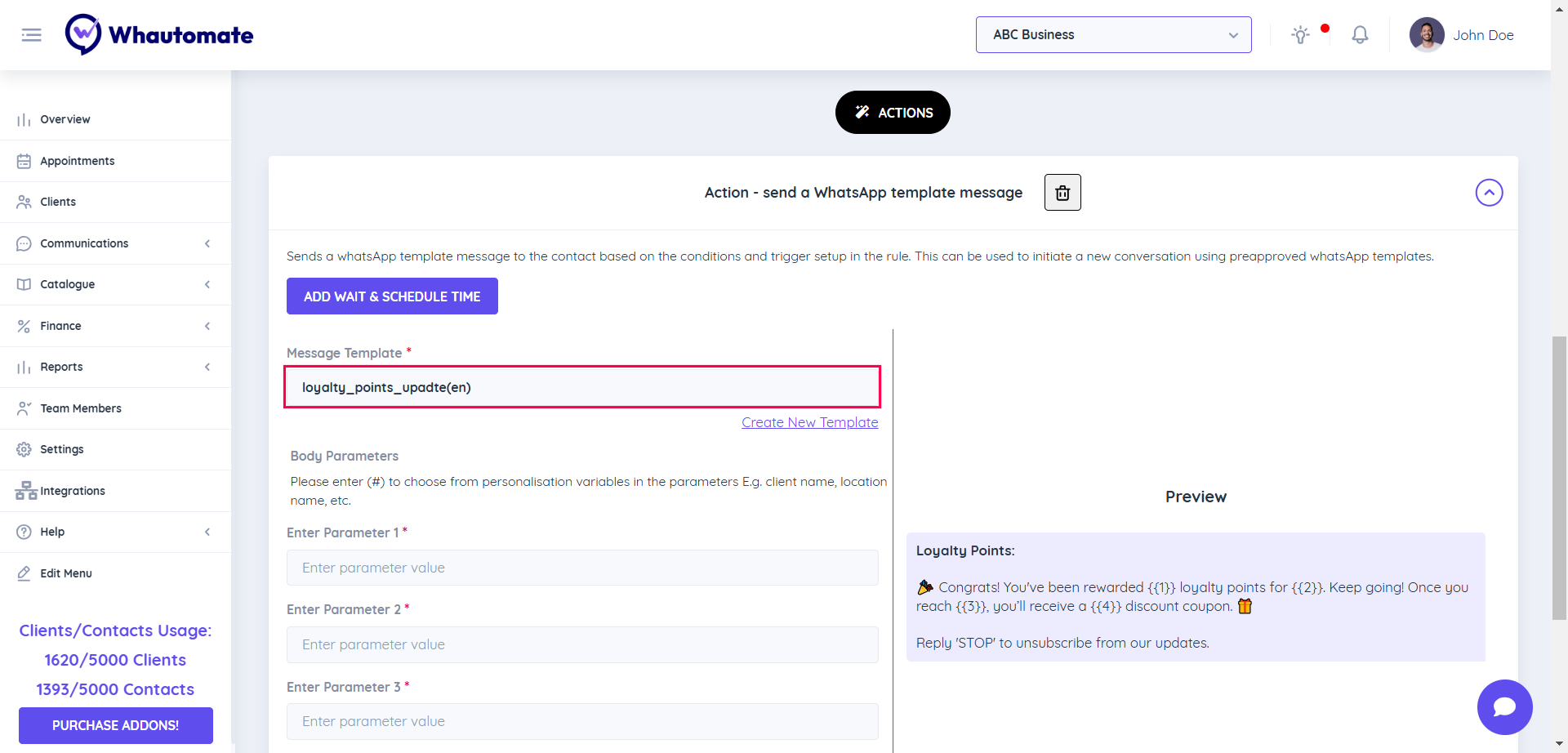 (i) Select a WhatsApp Template Message Choose the pre-approved WhatsApp message template you want to use for loyalty points notifications.