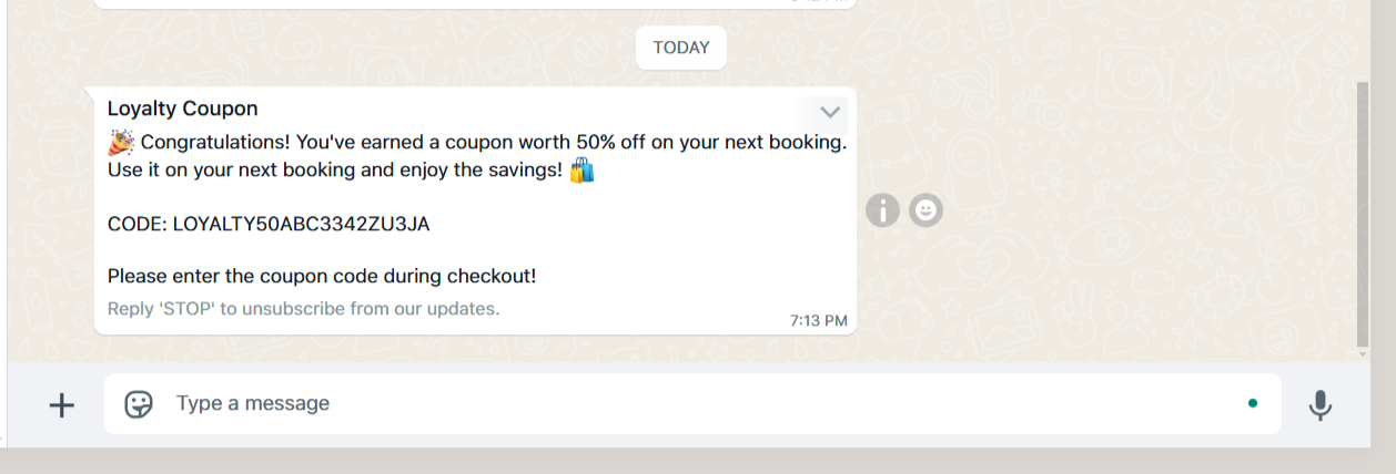 The coupon will be automatically sent to the test client via the selected notification channel (WhatsApp) for seamless redemption. 👇