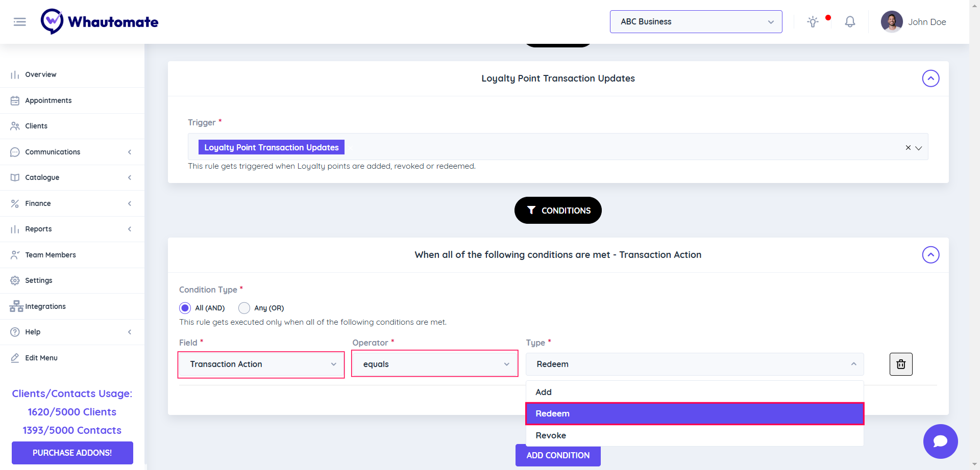 Condition Type: Select "Redeem".