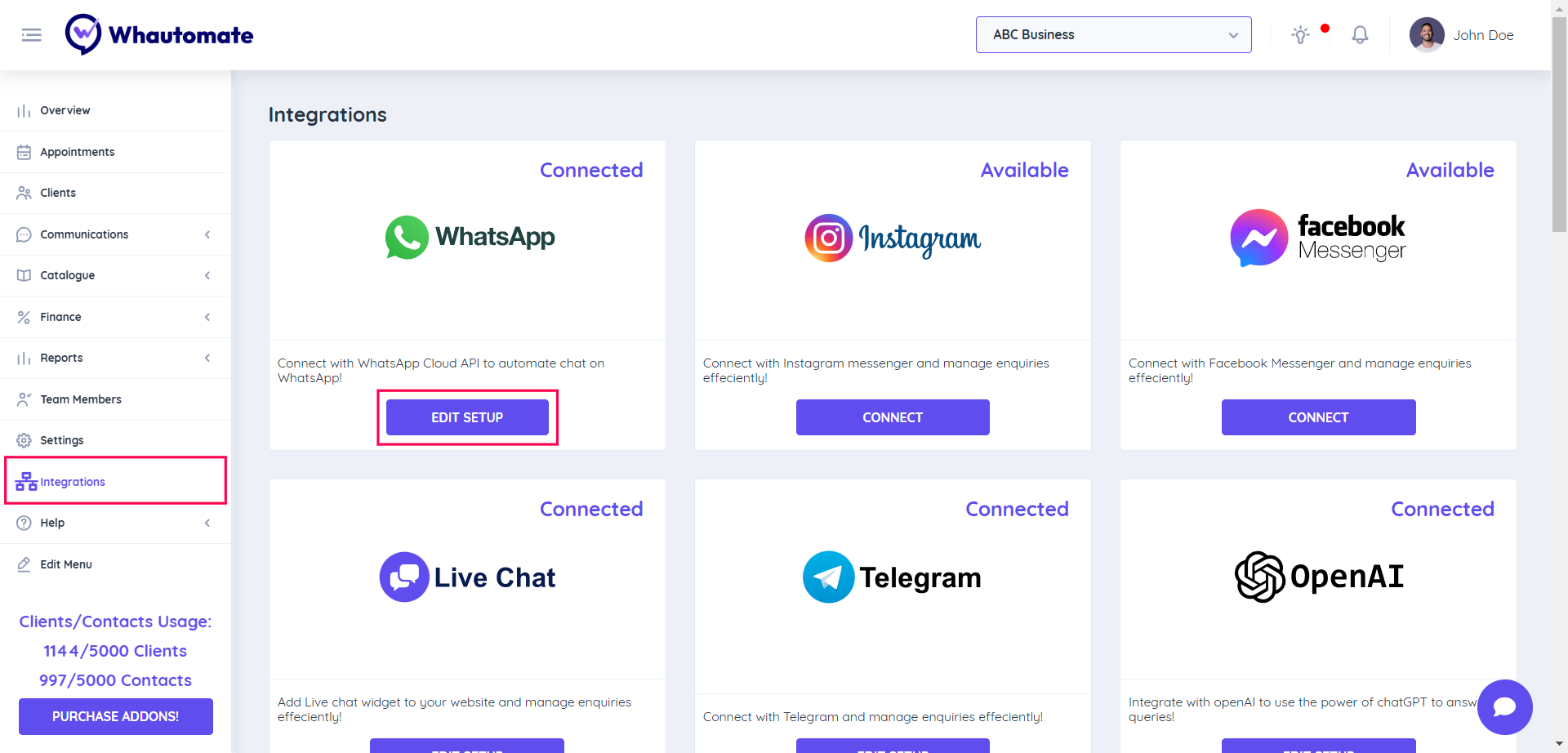 1. Navigate to the **Integrations** menu in the Whautomate app.