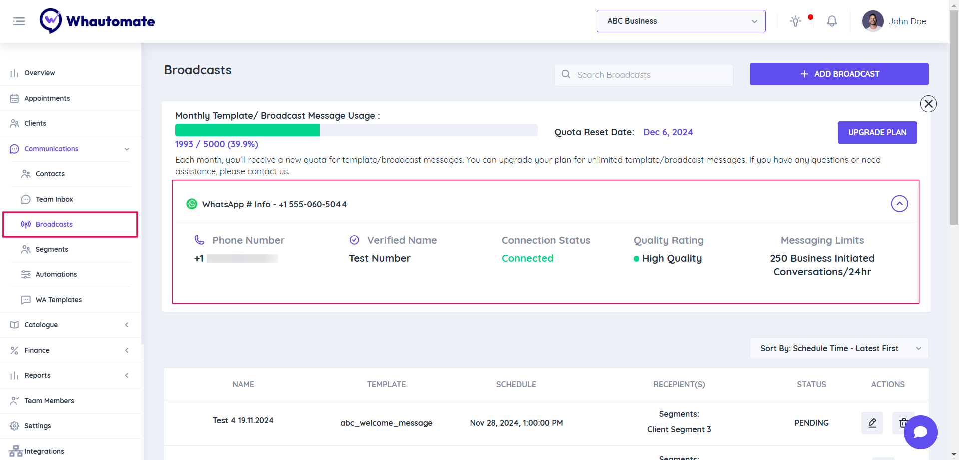 1. Go to the **Broadcasts** menu in the **Whautomate app** under the **Communications** section.