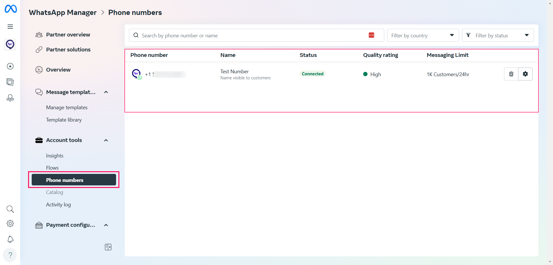 2. In the **Phone Numbers** menu under **Account Tools**, select your WhatsApp number.