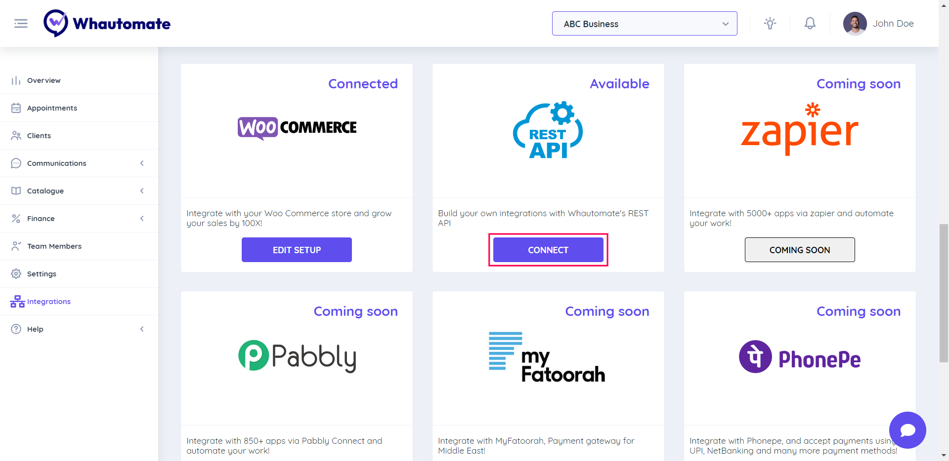 **Step 1:** Go to the Integrations page in the Whautomate platform then scroll down and select the **REST API** connect button to continue.