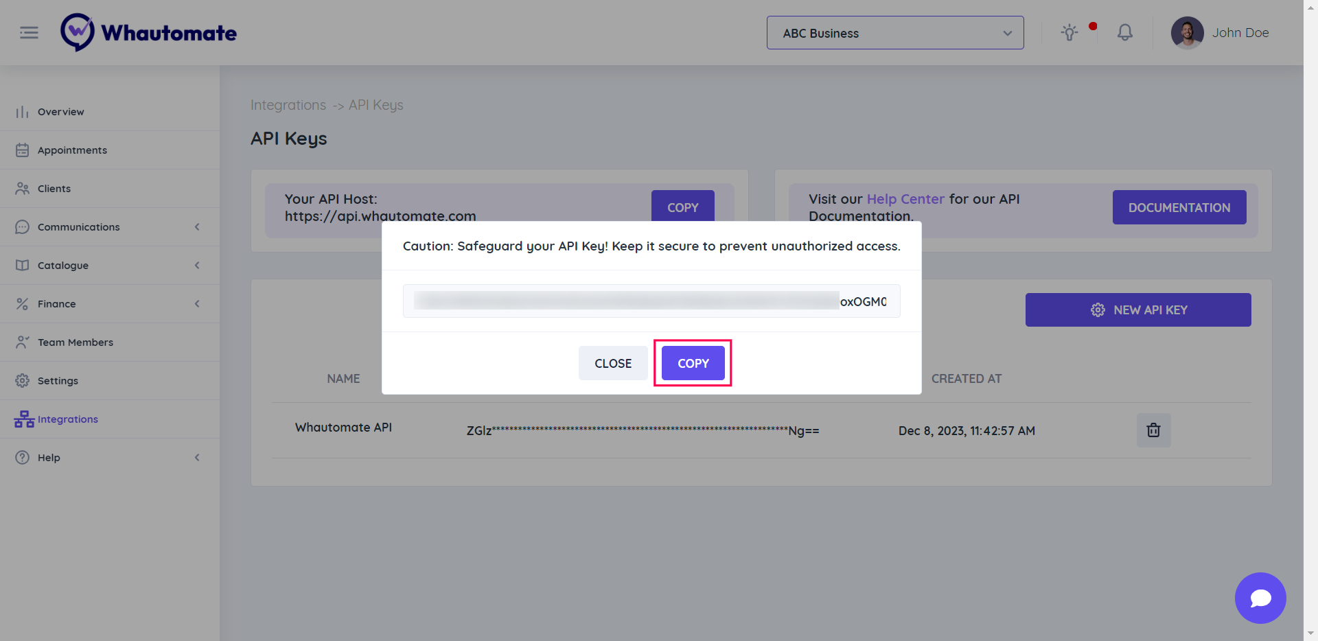 **Step 4:** Your Whautomate API key has been generated successfully just copy and use it.